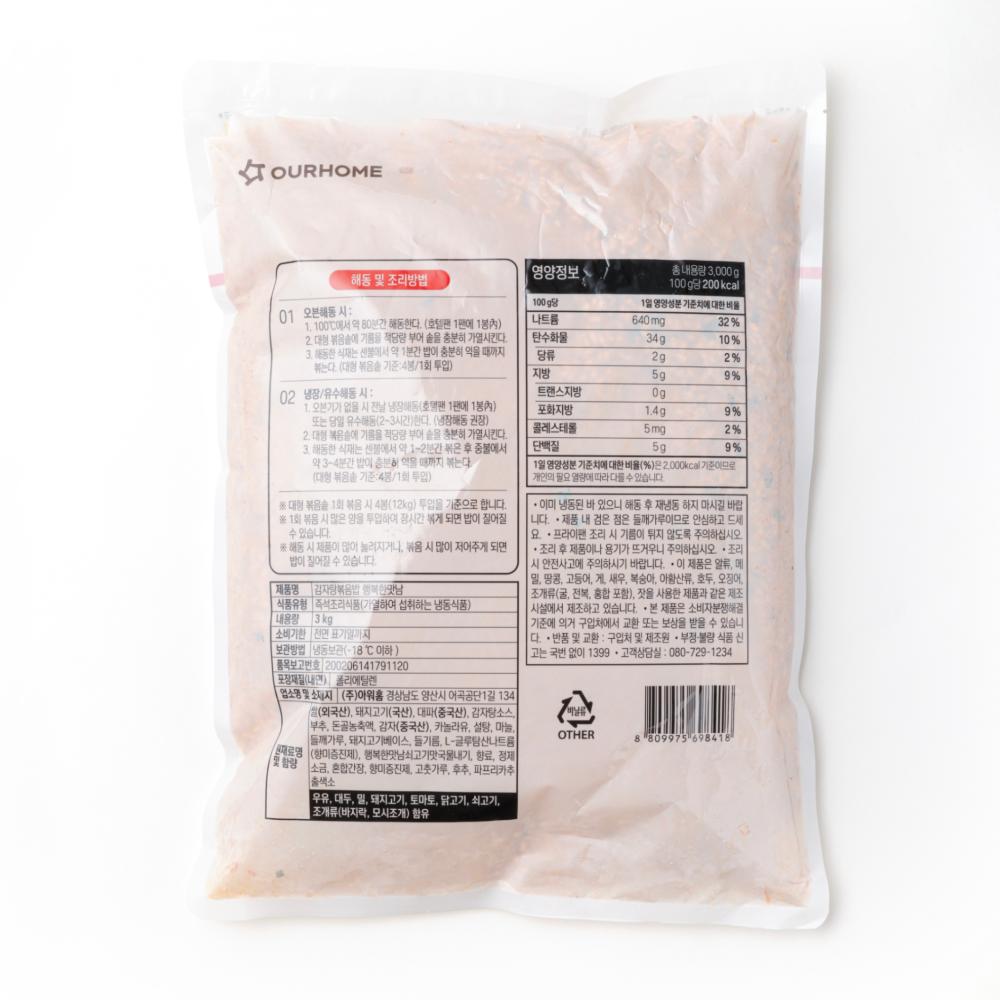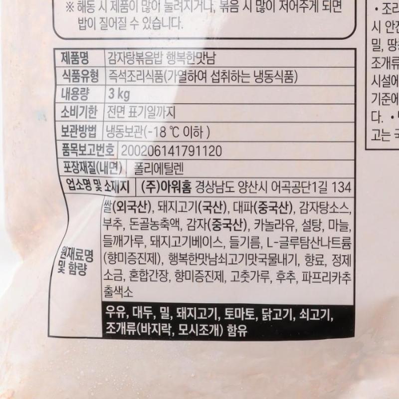 제품 정보 원산지명 원산지정보는 표시사항을 참고하여 주시기 바랍니다. 단위/규격 PK.(3kg) 보관온도 냉동 HACCP 인증여부 Y 소비기한 냉동9개월 식품의 유형 즉석조리식품(가열하여섭취하는냉동식품) 박스당수량 1