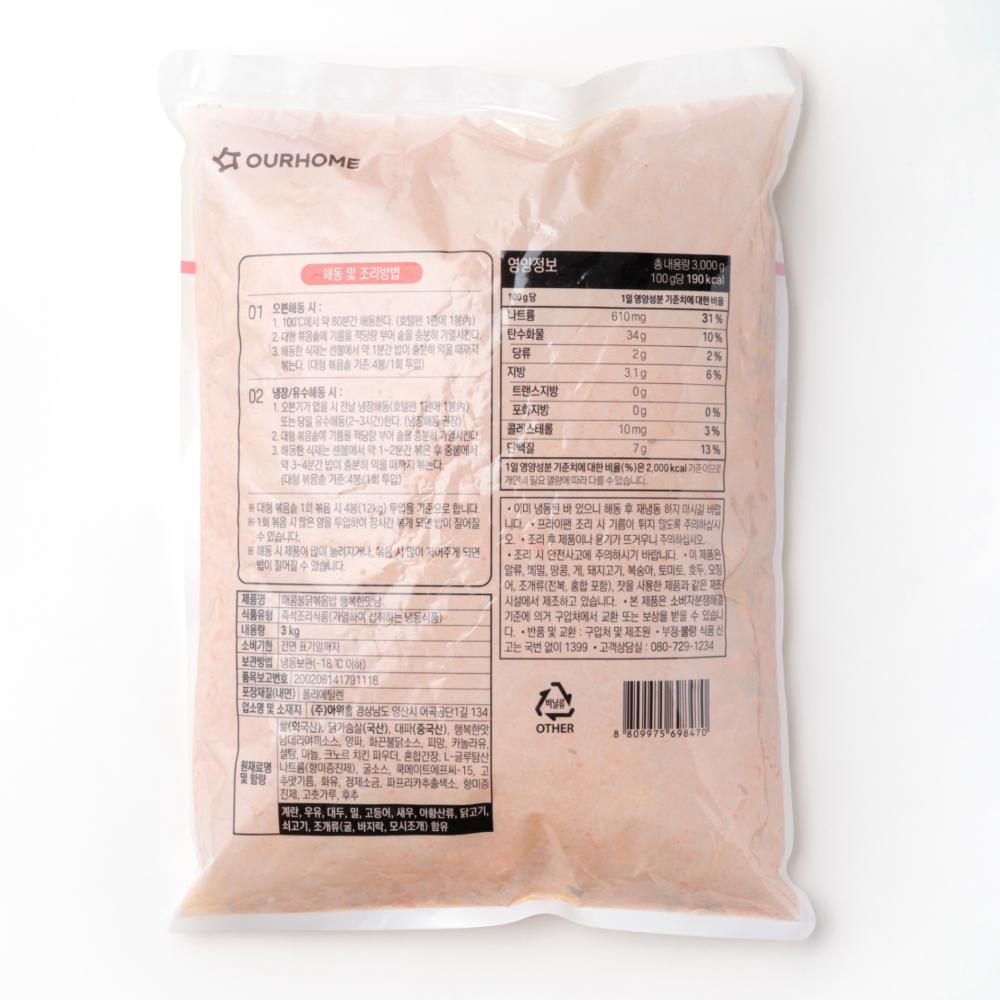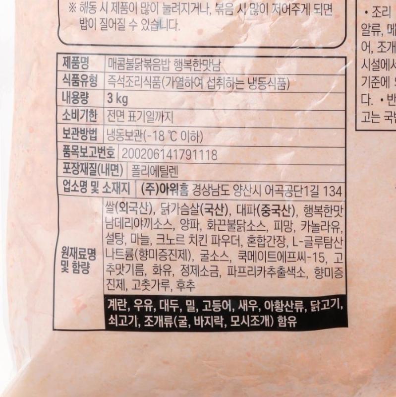 제품 정보 원산지명 원산지정보는 표시사항을 참고하여 주시기 바랍니다. 단위/규격 PK.(3kg) 보관온도 냉동 HACCP 인증여부 Y 소비기한 냉동9개월 식품의 유형 즉석조리식품(가열하여섭취하는냉동식품) 박스당수량 1