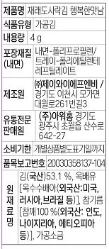 제품 정보 원산지명 원산지정보는 표시사항을 참고하여 주시기 바랍니다. 단위/규격 PK.(4g*16ea/9절8매) 보관온도 실온 주요 원재료 및 함량 김(국산) 54.1%, 카놀라유(캐나다산), 들기름(중국산), 참기름, 맛소금 등 식품의 유형 조미김 과면세 과세
