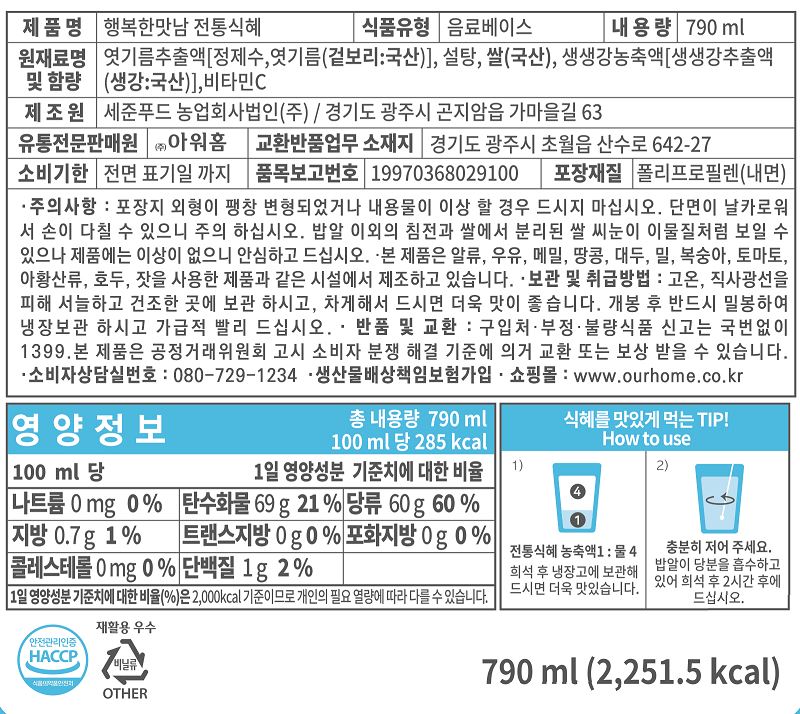 제품 정보 원산지명 원산지정보는 표시사항을 참고하여 주시기 바랍니다. 단위/규격 PK.(790㎖) 보관온도 실온 주요 원재료 및 함량 엿기름추출액[엿기름(겉보리:국산)], 백설탕,멥쌀(국산), 생각엑기스-200, 비타민C HACCP 인증여부 O 과면세 과세