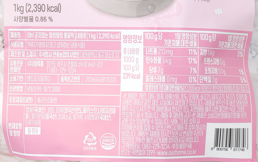제품 정보 원산지명 원산지정보는 표시사항을 참고하여 주시기 바랍니다. 단위/규격 PK.(1kg/(20g*2ea)*25봉지) 보관온도 냉동 HACCP 인증여부 HACCP 인증 소비기한 제조일로부터 12개월 식품의 유형 떡류(가열하지않고 섭취하는 냉동식품) 박스당수량 PK