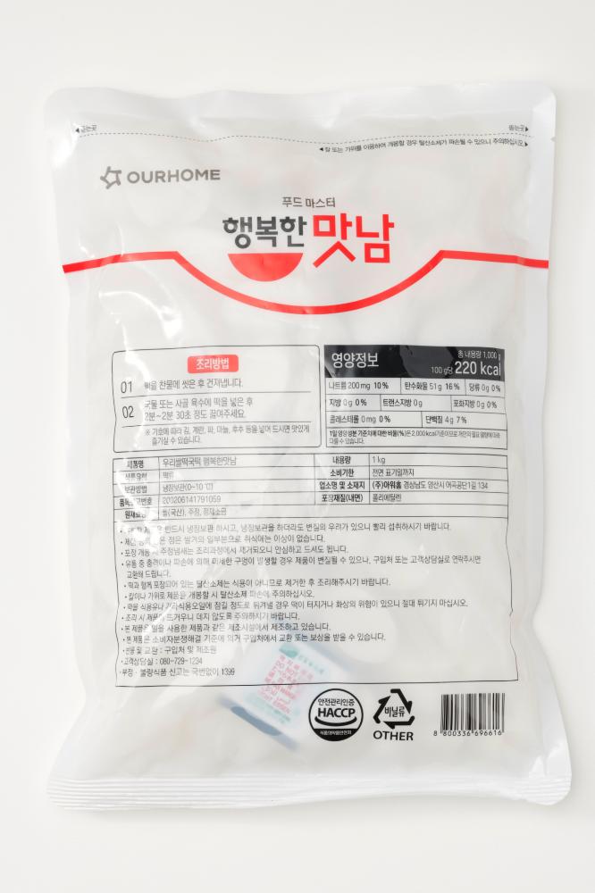 제품 정보 원산지명 원산지정보는 표시사항을 참고하여 주시기 바랍니다. 단위/규격 PK.(1kg_국산) 보관온도 냉장 HACCP 인증여부 O 소비기한 3개월 식품의 유형 떡류 박스당수량 12