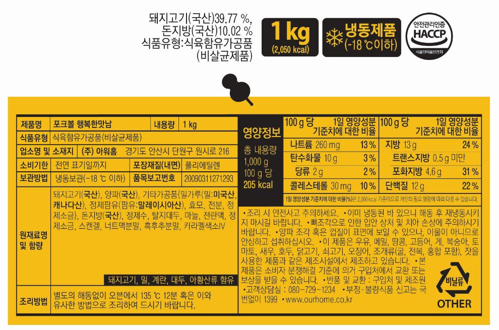 제품 정보 원산지명 원산지정보는 표시사항을 참고하여 주시기 바랍니다. 단위/규격 PK.(개당30g*33ea±3ea) 보관온도 냉동 HACCP 인증여부 Y 소비기한 12개월 식품의 유형 식육가공품 박스당수량 10